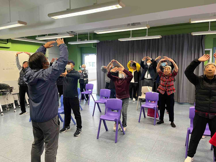 學生在課堂中示範整套動作,長者們隨後模仿練習,起初略有混亂,但在學生逐一協助下,動作日趨流暢。課堂中笑聲不斷,長者彼此互勉,學生亦給予鼓勵。這堂課不僅幫助長者熟習整套動作,更提升了大家的自信與凝聚力。